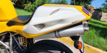 The liquid-cooled 748cc Desmoquattro DOHC L-twin features an electric starter, Weber-Marelli fuel injection, four desmodromically actuated valves per cylinder, and a two-into-two exhaust system with dual mufflers under the tail section. Factory-rated output was 97 horsepower and 55 lb-ft of torque. The seller tells us that the timing belts were changed in June 2022 and that replacement fuel pump hoses were fitted in April 2023. The battery was replaced in June 2025.